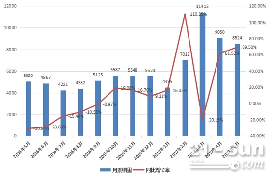 2017年5月,国内25家主要装载机生产企业合计销售各类装载机8524台,同比去年5月份5029台,大幅增长69.50%。最近8个月来,装载机有7个月实现同比正增长(仅3月份下滑20%);今年1-5月份,装载机累计销量为40493台,同比增长约26.06%,市场持续升温。